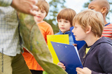 Children with clipboard play treasure hunt