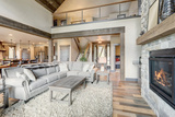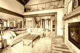 Living room luxury interior with large stone fireplace and leather furniture and huge tall windows with natural tones with TV.
