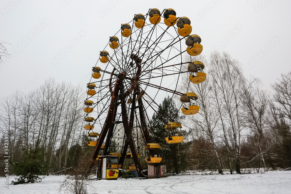Abandoned amusement park in ghost town Prypiat. Priryat, Chornobyl exclusion zone. December 2016