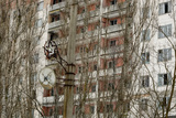 Abandoned ghost town Prypiat. Overgrown trees and collapsing buildings. Pripyat, Chornobyl exclusion zone. December 2016
