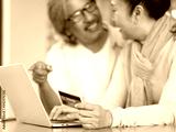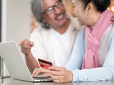 Close up Hand holding a credit card Asian senior couple happy using laptop while working on their finances at home. Technology, Finance and communication