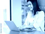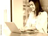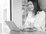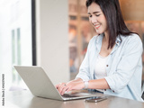 Asian woman happy using laptop sitting in room work from home. Technology and communication
