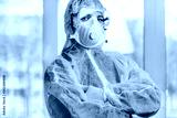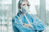Portrait of woman doctor weaing protective suit during coronavirus pandemic, . Hazard suit, respiratory mask, gloves and glasses clinic or hospital. Protection from coronavirus, covid-19 epidemic