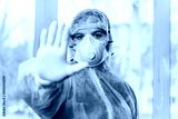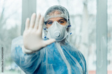 Concept of coronavirus quarantine, global covid-19 epidemic. Treatment of infection. Medic in hazrat protective suit show hands gesture for stop corona virus outbreak