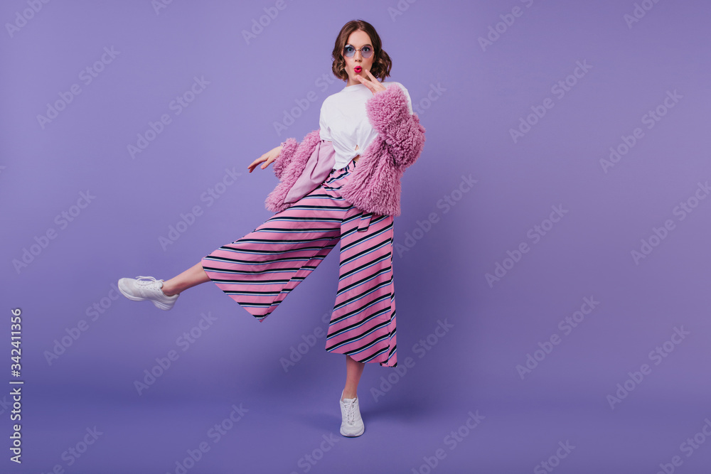 Surprised lovely girl in white shoes posing on purple background during indoor photoshoot. Full-length portrait of interested curly woman in pink pants and elegant fur jacket.