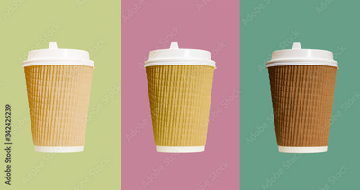 Three paper coffee cups with white lid isolated on colorful backgrounds.