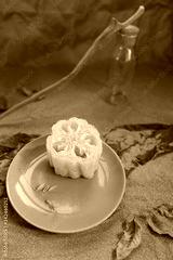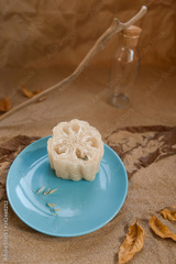 Luffa sponge on a ceramic blue trowel. Background sand and craft paper.