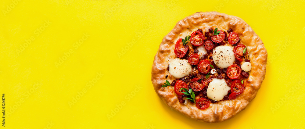 Homemade pizza on yellow background. The concept of traditional Italian food. Stay at home