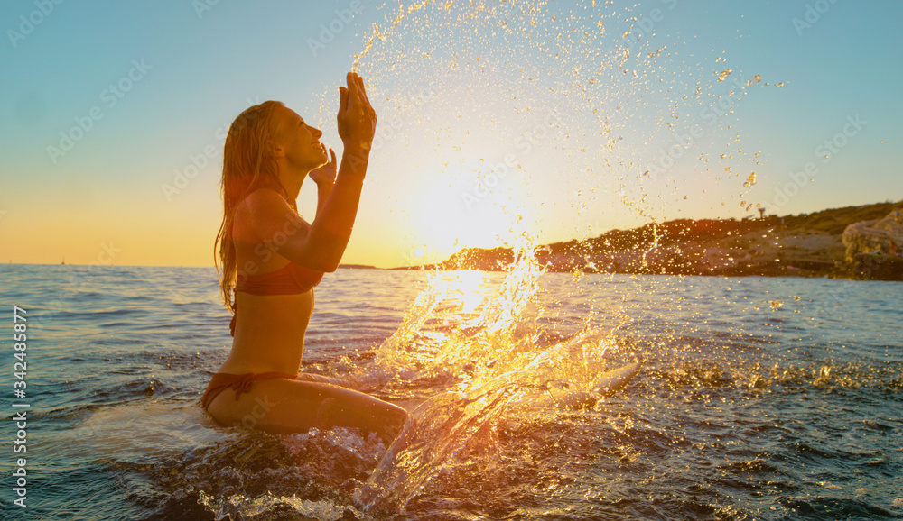 CLOSE UP: Smiling surfer girl splashes water while sitting on her surfboard