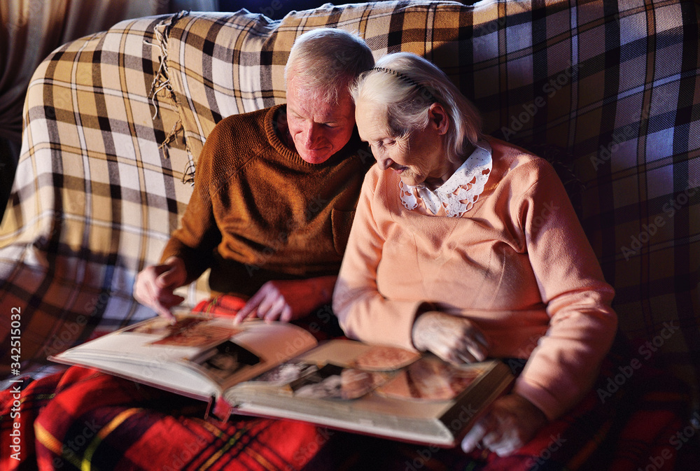 an elderly married couple-a man and a woman in a cozy house sitting on the sofa and wrapped in a warm plaid plaid hug each other and smile while viewing the family photo album.