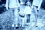 Happy beautiful family with dog labrador is having fun together walking the in park.