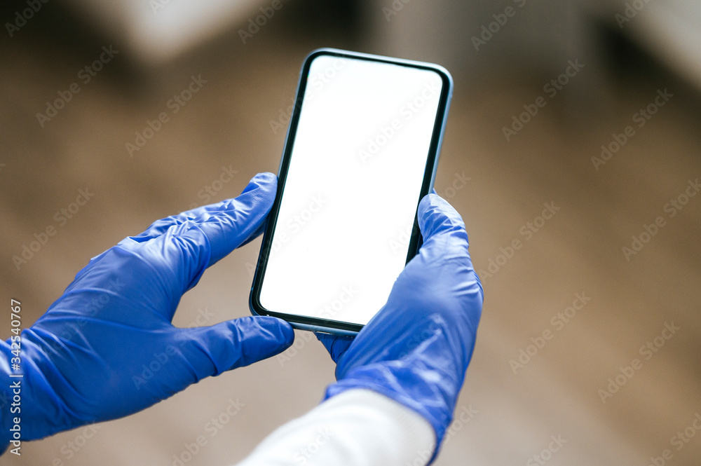 Close-up of hands with medical gloves using mobile phone with blank screen