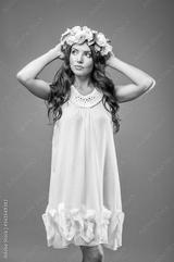 Spring portrait of sexy bride's hairstyle with a peonies wreath isolated on a gray background.