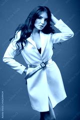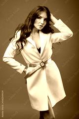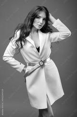 model girl posing in fashionable white cloak , spring fashion, beautiful young brunette isolated on gray background.