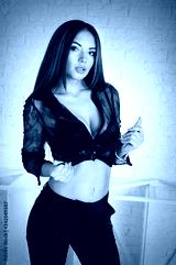 glamorous sexy brunette stands in flared pants, top t-shirt on light background