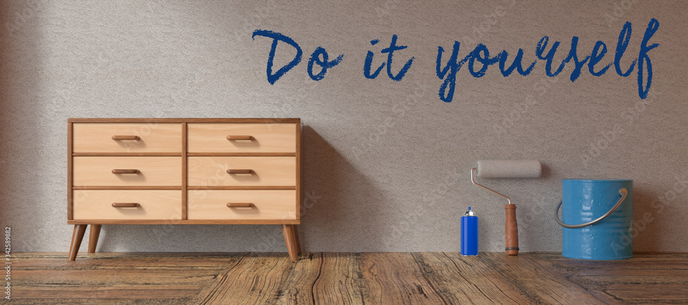 living room scene with paint bucket and message DO IT YOURSELF on a plastered wall