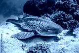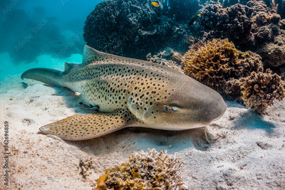 Leopard shark resting on the sea bed among colorful coral reef