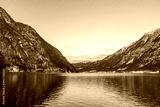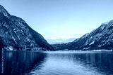 Sunset view of Obertaun village by Hallstatt lake with snowy mountain during winter time in Austria