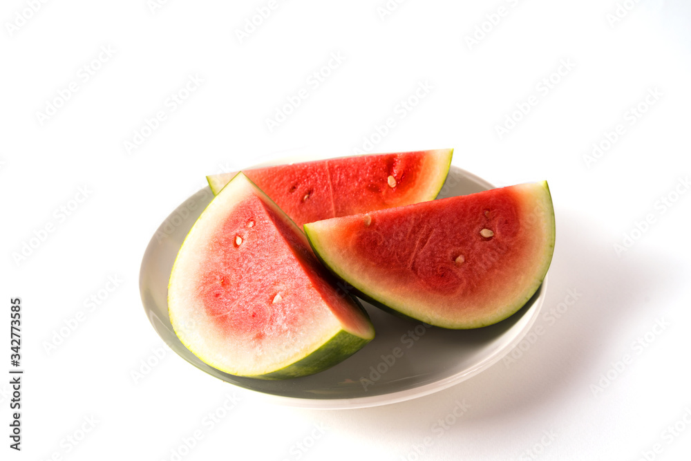 Top view pieces of fresh juicy Watermelon on a plate , isolated on white background, copy space for text.