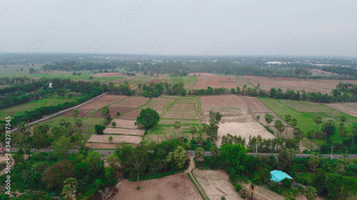 Aerial view of green fields and farmlands in rural Thailand.