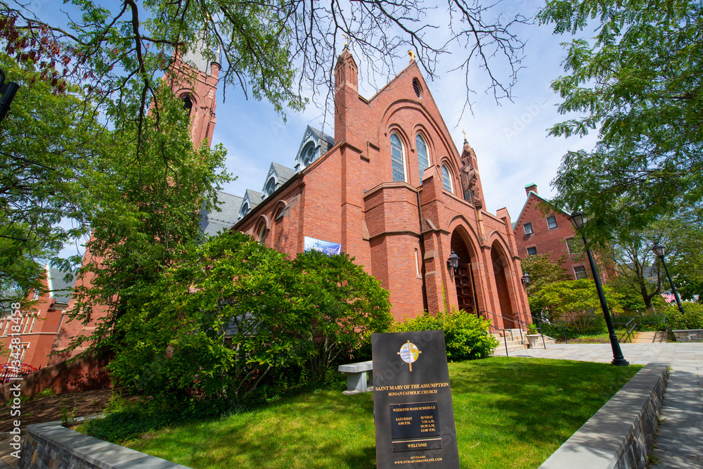 Saint Mary of the Assumption Parish Church at 5 Linden Pl at Harvard Street in Brookline Village, town of Brookline, Massachusetts MA, USA.