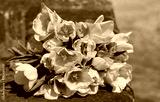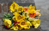 In spring, a colorful bouquet of fresh tulips lies on an old brick wall against a light background