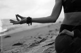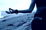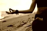 Meditating girl on the seashore during sunset. She is sitting in a lotus position. Close-up photo