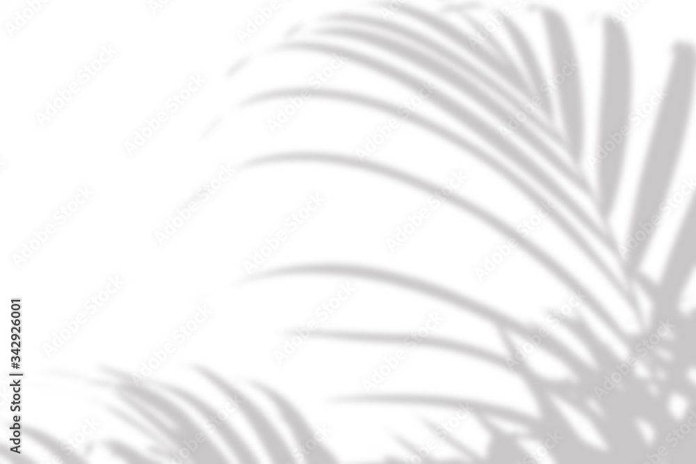 Blurred overlay effect for photo. Gray shadow of the palm leaves on a white wall. Abstract neutral nature concept background. Dappled light. Shadows for natural light effects