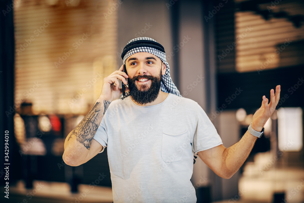 Attractive smiling tattooed bearded arab guy standing indoors and having conversation on smart phone.