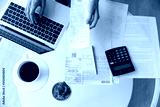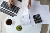 Above top view close up young woman holding utility bills or receipt, managing monthly expenses with e-banking application on computer, professional accountant or bookkeeper doing paperwork indoors.