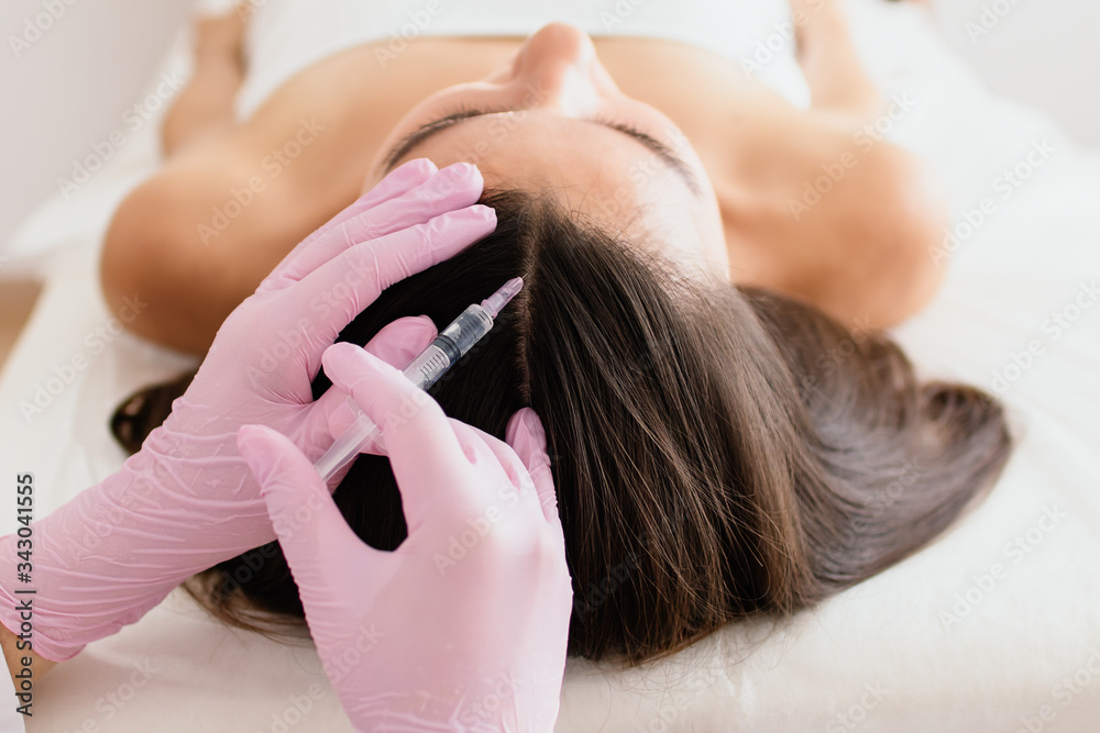 Young woman receiving hair mesotherapy injections from a professional trichologist.Doctor's hands in pink gloves.hair treatment in cosmetology using mesotherapy. injection to the head.selective focus