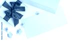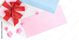 Pink gift box with red bow and blank greeting card for Valentine's day, love letter or wedding invitation. Top view. White background decorated with pink flowers.