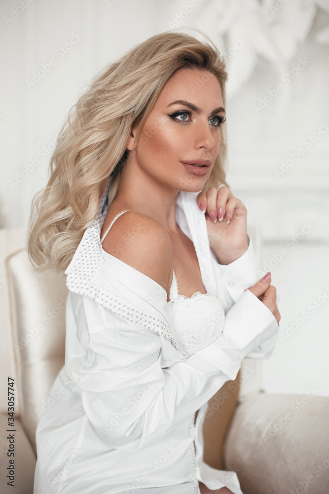 Sexy blonde woman in white shirt and lingerie. Beautiful fashion blond model in modern interior. Alluring female with makeup and curly hair style posing on armchair.