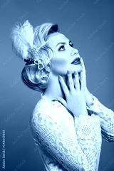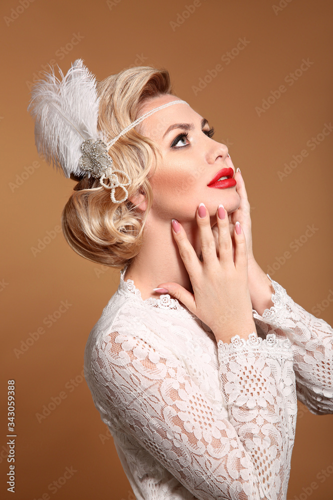 Retro woman with red lips and wavy hairstyle, feather in head. Elegant lady in wedding white dress posing isolated on studio beige background. Beautiful blonde bride. Vintage style photo.