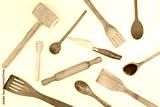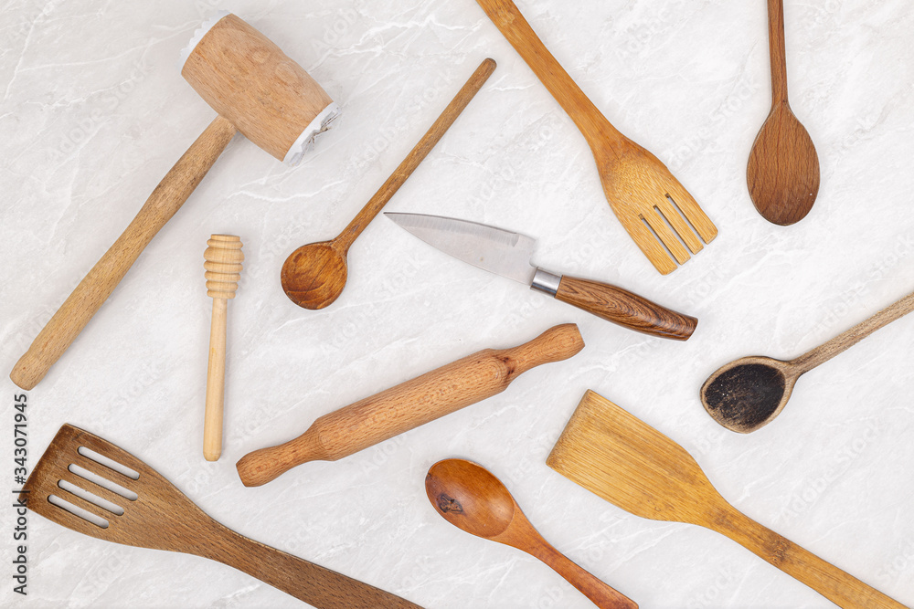 Top view of kitchen wooden utensils on the grey marble kitchen table top. Food concept with kitchen utensils on the grey background