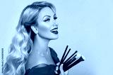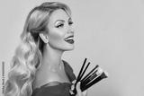 Beauty makeup artist woman portrait. Happy smiling and laughing blond girl with professional brushes for visage posing on studio isolated on beige background.