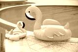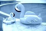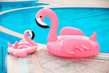 Family look. Two Pink pool floats flamingo by blue water, pool party toy. Giant Inflatable Swimming Ring. Summer vacation holiday luxurious resort.