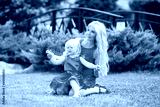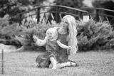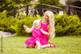 Family look. Beautiful blonde mother with her daughter in pink dresses playing on green grass at spring park. Happy fun same girls. Lifestyle concept.