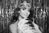 Beautiful brunette with Healthy wavy hair. Christmas holiday party. Fashion Beauty Girl with carnival mask Isolated on golden bokeh lights Background. Glamour Makeup. Jewelry copy space. Hairstyle.