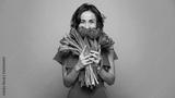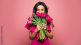 International Women's Day. Extremely happy woman in a bright pink dress is smelling a bunch of spring flowers, which she is holding in her hands.