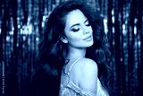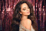 Beautiful brunette with Healthy wavy hair. Glamour Makeup. Fashion Beauty Girl with carnival mask Isolated on bright bokeh Christmas lights Background. Gold Jewelry copy space. Hairstyle.