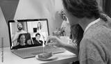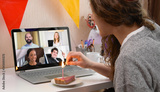 Woman celebrating her birthday through video call virtual party with friends. Lits and blows out candle. Authentic decorated home workplace. Coronavirus outbreak 2020.
