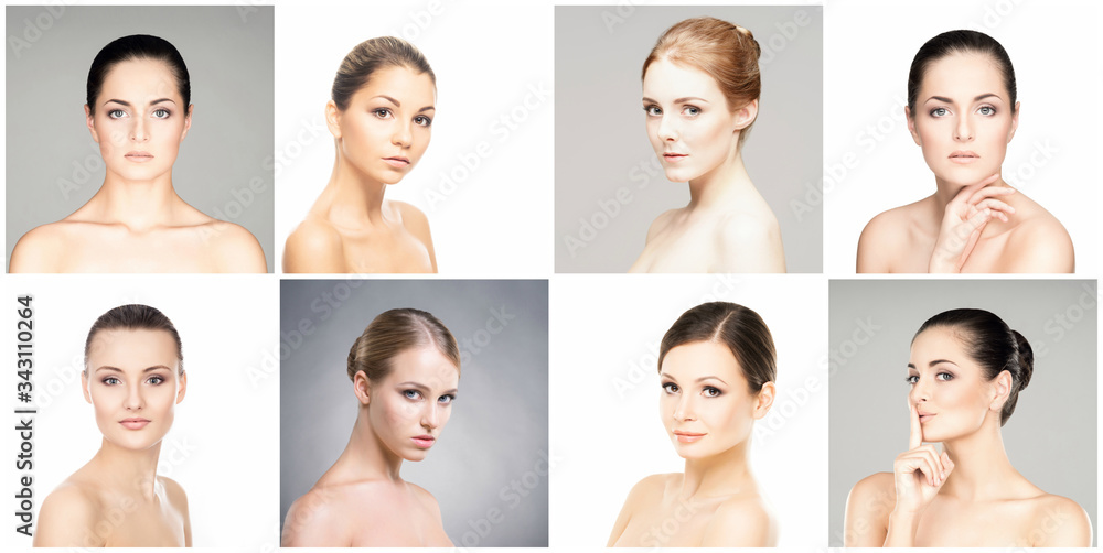 Beautiful, pure and healthy female faces. Portraits of young and pretty women in collage. Skin lifting, skincare, plastic surgery and make-up concept.