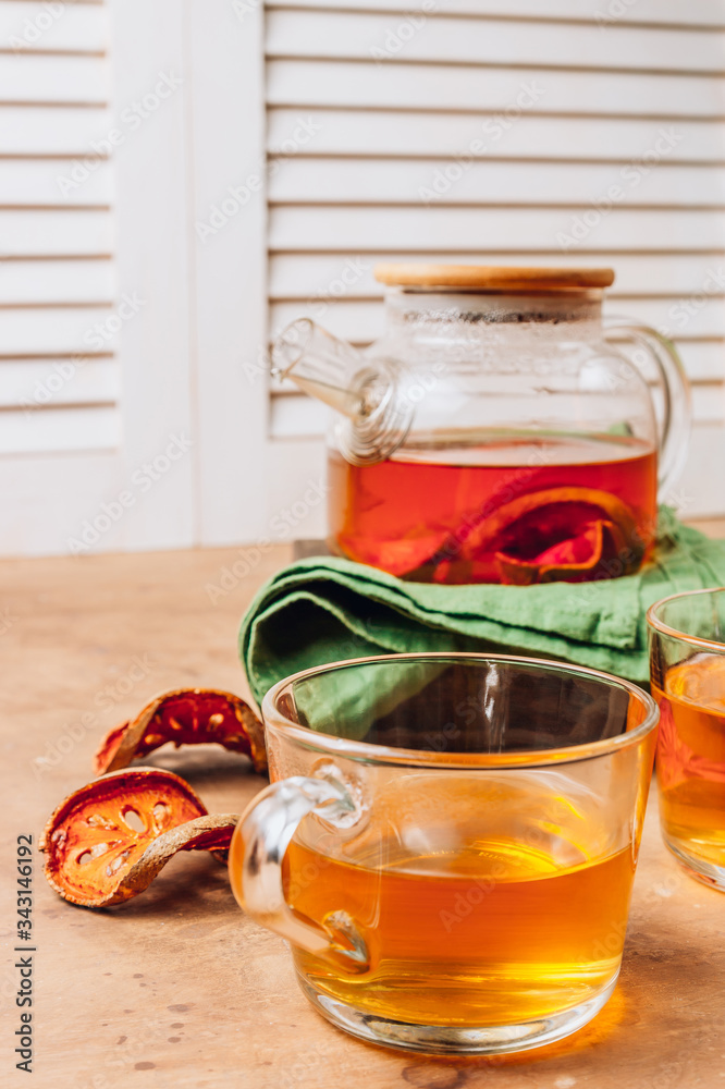 Bael fruit juice or quince tea and dried bael sliced fruit on rustic background. Thai or Asian healthy drink. Bael is helping the body to resist catching a cold.