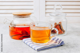 Bael fruit juice or quince tea and dried bael sliced fruit on light gray background. Thai or Asian healthy drink. Bael is helping the body to resist catching a cold