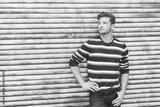 Beautiful man posing, handsome guy with colorful sweatshirt