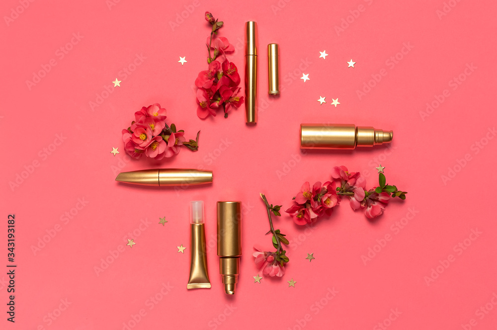 Cosmetics Branding Concept. Cosmetics, spring pink flowers, gold stars confetti on pink background. Cosmetic mock up gold bottles. Flat lay top view copy space. Cosmetic products, beauty background