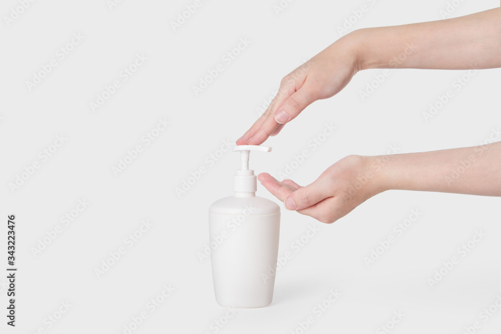 Hand antibacterial sanitizer dispenser pump, alcohol gel to wash hands, liquid soap to clean hands free from viruses and diseases. Please wash your hands concept photo of handwashing isolated on white