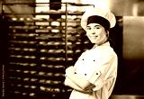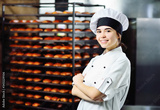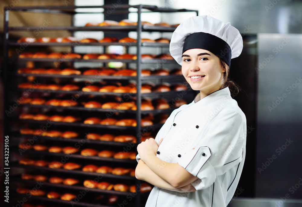 A professional Baker-a young, pretty woman in a white tunic and chef's hat smiling idly against the background of shelves with fresh rolls, bread and muffins. Bakery production, bakery.