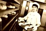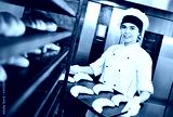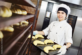 professional Baker - a young attractive woman in a white chef's jacket and cap smiles and holds a tray of raw croissants against the background of a bakery or bread factory.